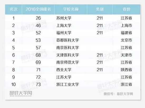 最好的十所地方大学中还有福州大学、首都医科大学、南京医科大学 、天津医科大学、南京师范大学、西北大学、江苏大学和浙江工业大学。